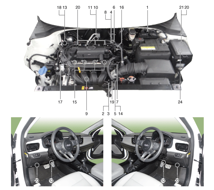 (APT) 14. ETC Motor [Integrated into ETC Module] 15 . Injector 16 . Purge Control Solenoid Valve (PCSV) 17 . Variable Fortce Solenoid (VFS) [Bank 1 / Intake] 18 . CVVT Oil Control Valve (OCV) [Bank 1 / Exhaust] 19. Variable Intake Solenoid (VIS) Valve 20 . Ignition Coil 21. Main Relay 22. Fuel Pump Relay 23. Data link Connector (DLC) [16 Pin] 24. Multi-Purpose Check Connector [6 Pin] |