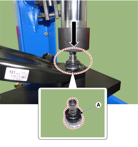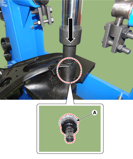 Using a press, remove the ball joint (A) from the lower arm.