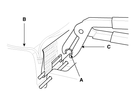 Remove the front seat cushion cover (C) from the front the seat cushion frame after removing the velcro tape (A) and hog-ring clips (B).